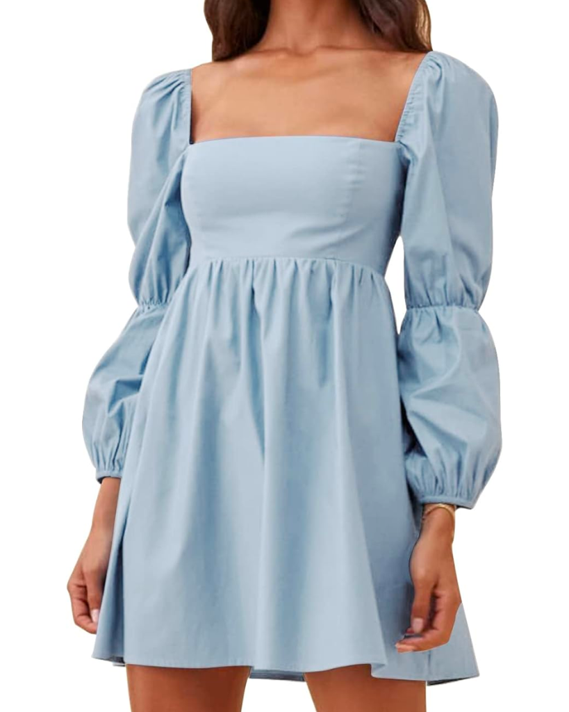 EXLURA Square Neck Mini Dress with Long Puff Sleeves