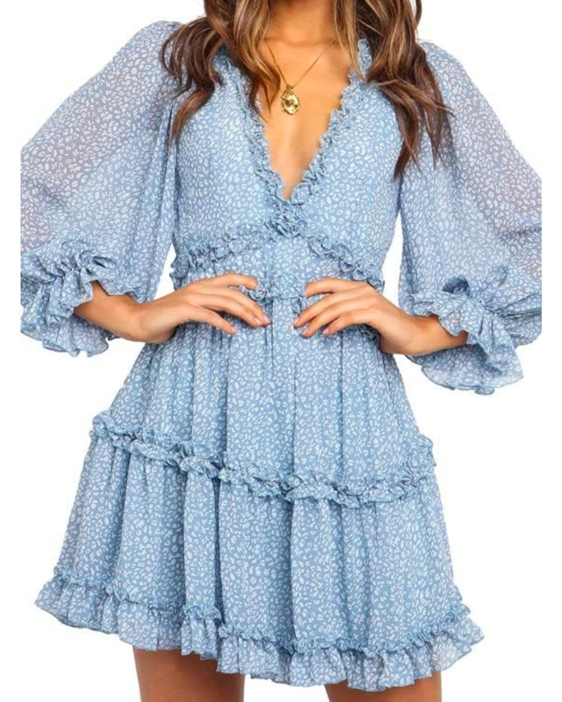 Floerns V Back Layered Ruffle Hem Flutter Sleeve Dress