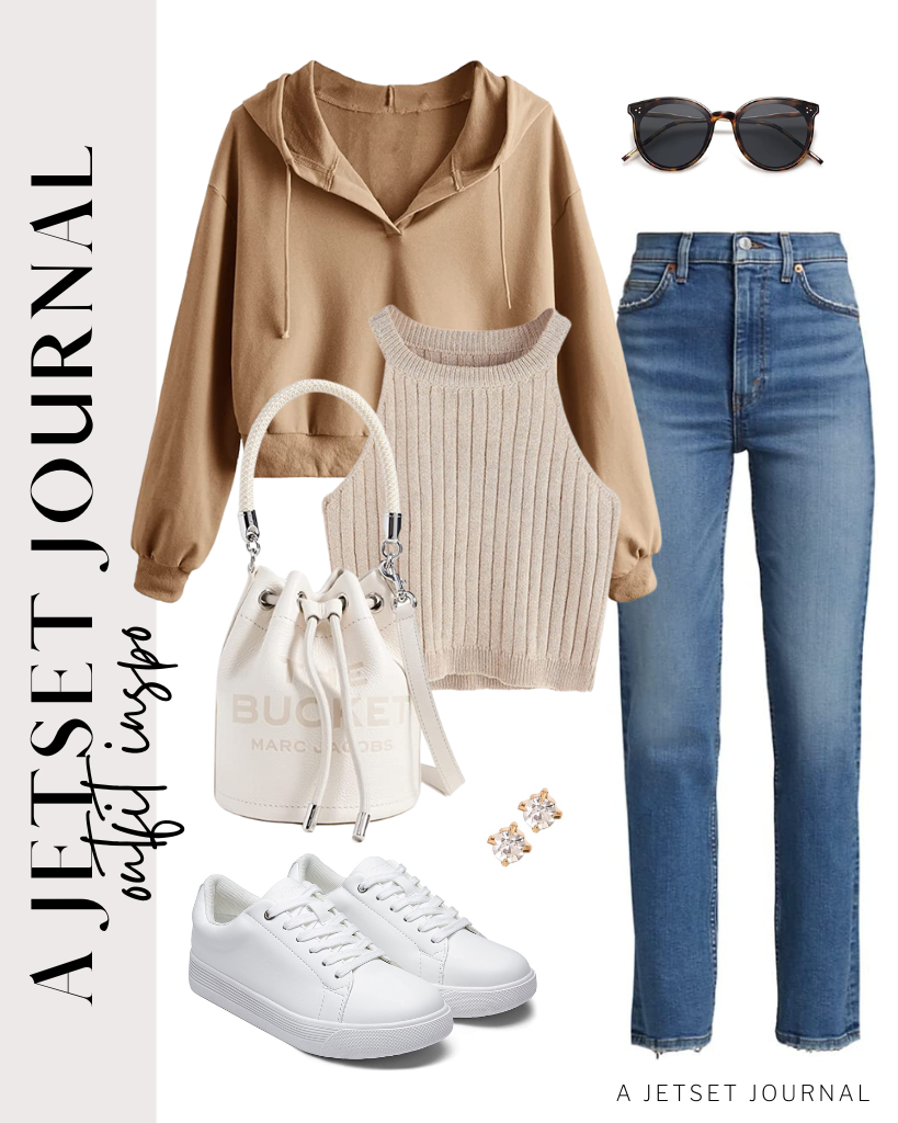 Outfit 2: Next up prioritizes comfort yet still looks stylish. I love pairing this tan cropped ribbed halter tank with another cropped hoodie in the same color. This allows for some dynamics in the layers without having to sacrifice comfort. Add on classic Levi’s straight-cut jeans, a neutral bucket bag, and all-white faux leather sneakers to dress up the lounge pieces more.