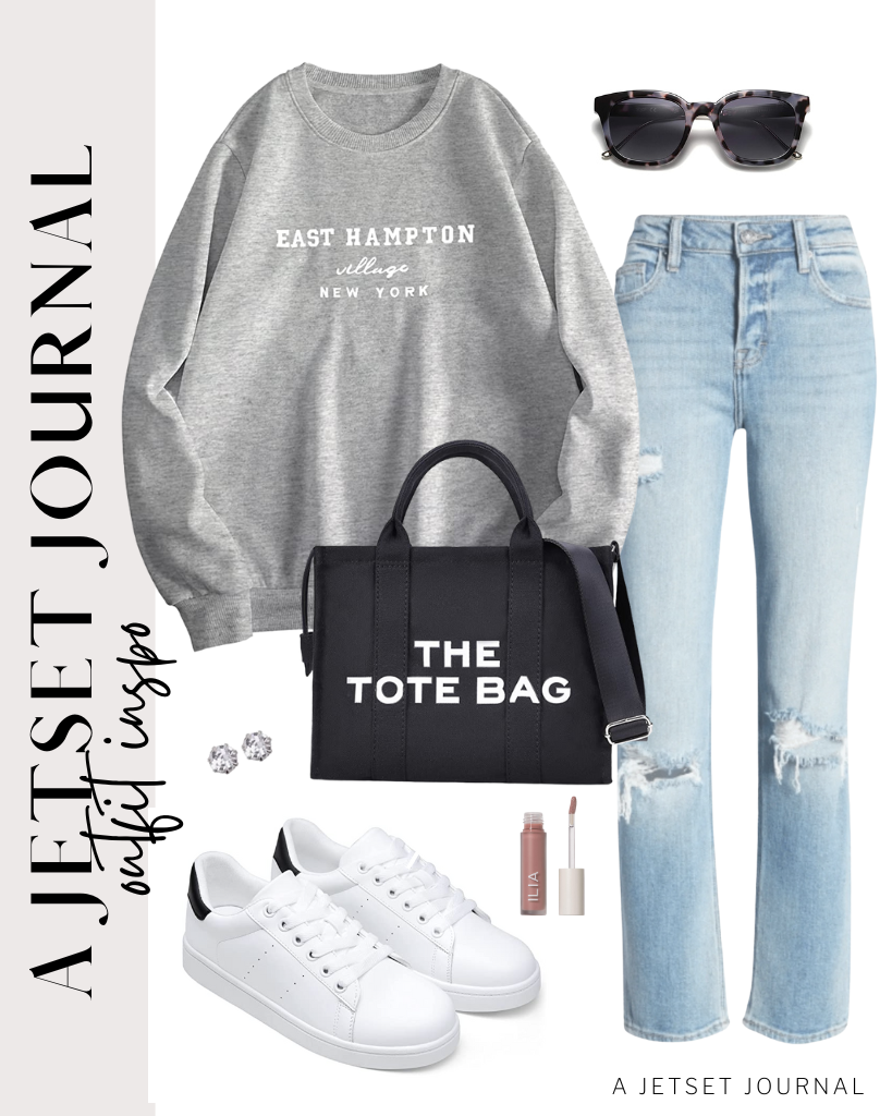 East Hampton Graphic Sweatshirt / SOJOS Classic Square Polarized Sunglasses / The Tote Bag / Levi’s Women’s Wedgie Straight Jeans / White Faux Leather Sneakers / Studded Earrings Set / Ilia Balmy Gloss Tinted Lip Oil