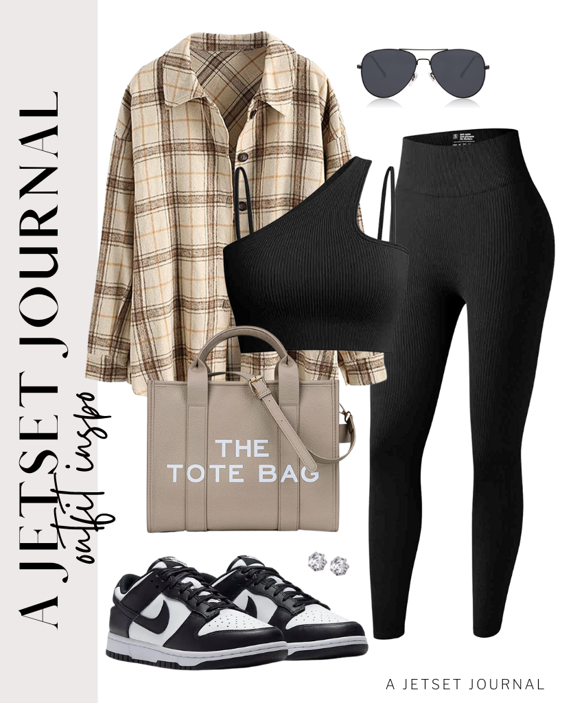 Plaid Long Sleeve Button Down Shirt / SOJOS Classic Aviator Polarized Sunglasses / 3 Piece Ribbed Seamless Bralette and Leggings Set / The Tote Bag / Women’s Nike Dunks / Studded Earrings Set