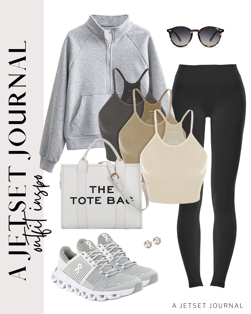 Womens Casual Half Zip Up Pullover / 3-Pack Seamless Rib-Knit Camisole Crop Tank Tops / SOJOS Retro Round Polarized Sunglasses / Buttery Soft Leggings / The Tote Bag / ON Women’s Cloudswift Sneakers / Studded Earrings Set