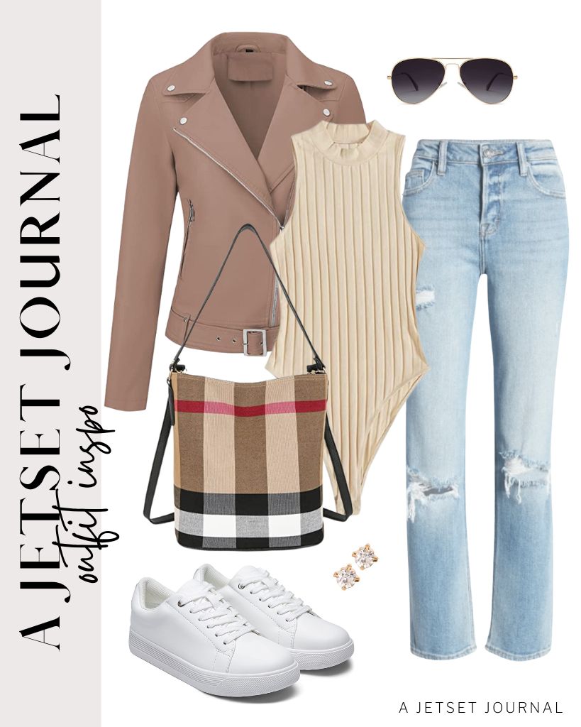 Faux Leather Short Motorcycle Jacket / SOJOS Classic Aviator Polarized Sunglasses / High Cut Ribbed Knit Mock Neck Bodysuit / Plaid Bucket Bag / Levi’s Women’s Wedgie Straight Jeans / White Faux Leather Sneakers / Studded Earrings Set