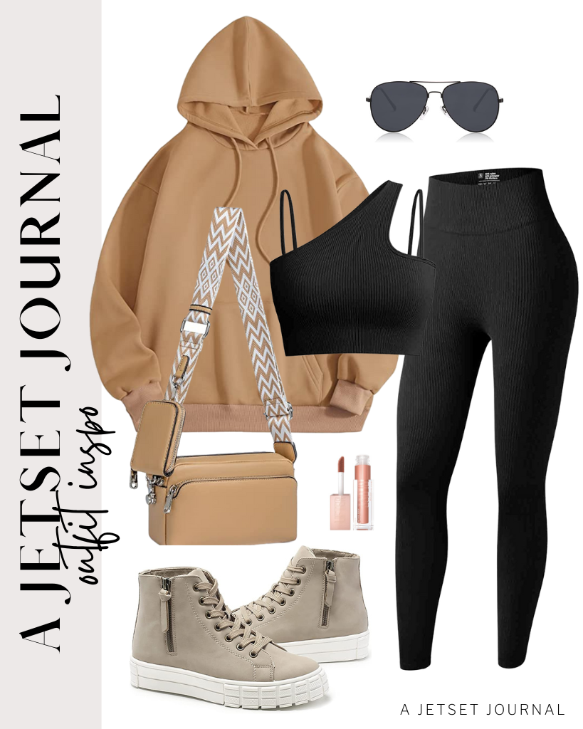 Oversized Drop Shoulder Hoodie / SOJOS Classic Aviator Polarized Sunglasses / 3 Piece Ribbed Seamless Bralette and Leggings Set / Wide Strap Camera Bag / Maybelline Lifter Gloss / Zip Up High Top Sneakers