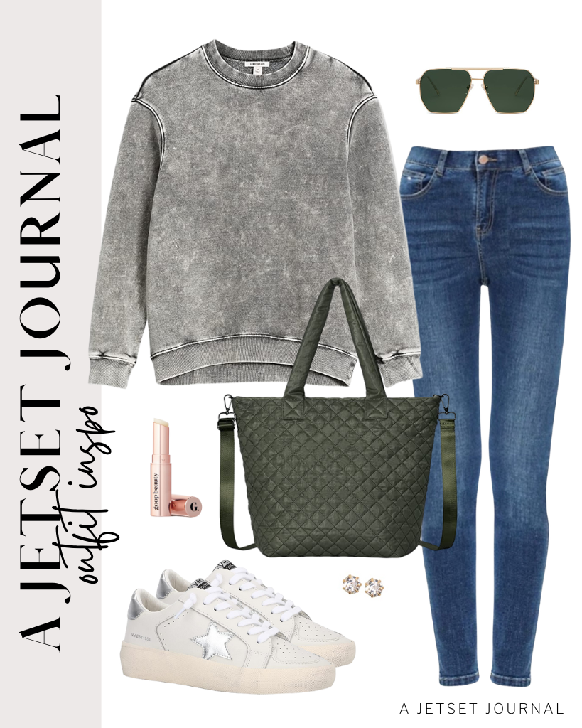 Women’s Heritage Fleece Crewneck Sweatshirt / SOJOS Retro Oversized Square Polarized Sunglasses / Mia High Rise Stretch Skinny Shaping Jeans / Goop Lip Balm / Quilted Tote Bag / VINTAGE HAVANA Women’s Reflex Sneakers / Studded Earrings Set