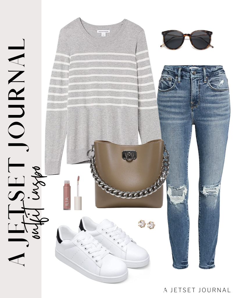 Amazon Essentials Striped Crewneck Sweater / SOJOS Classic Retro Round Sunglasses / Women’s High Rise Skinny Stretch Jeans / Faux Leather Chain Bucket Bag / ILIA Lip Oil / White Faux Leather Sneakers / Studded Earrings Set