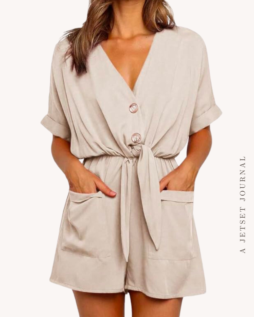 For the perfect one piece outfit, you have to check out the Ivay Romper. It has a v-neckline with button details. It also ties in the front to give yourself some definition. Plus it has pockets!