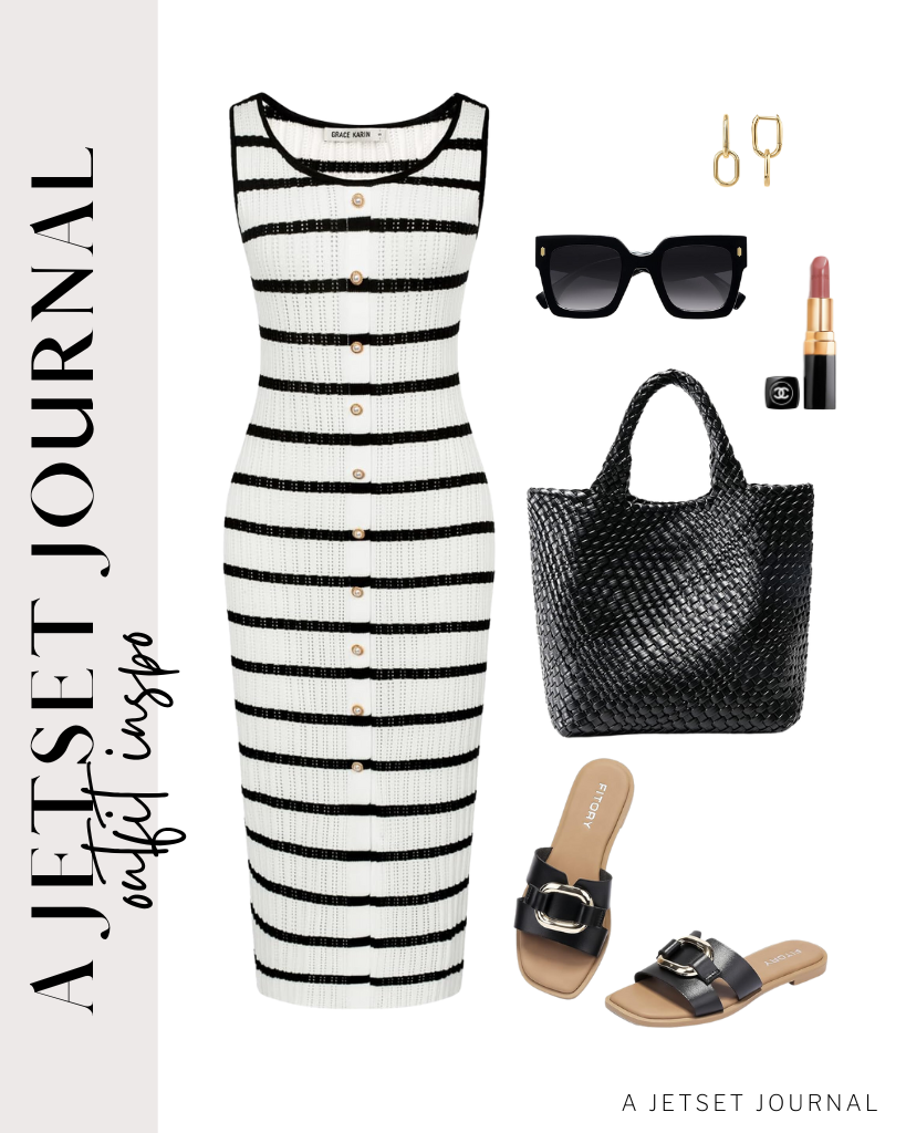 Outfit 1: A white and black striped crochet midi dress paired with black slide sandals with a thick buckle detail. Accessorize with a black woven shoulder bag and vintage style oversized sunglasses.