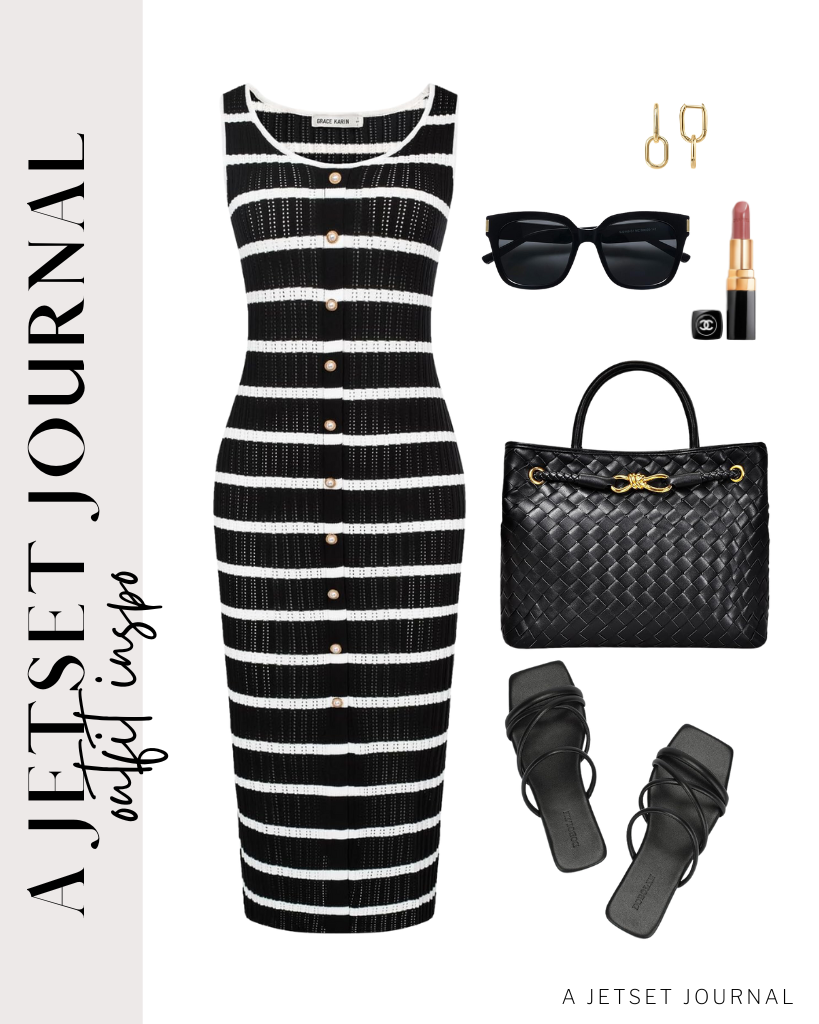 Outfit 5: A black and white striped crochet midi dress paired with square toe strappy black slide sandals. Accessorize with a black shoulder bag that has a fun gold detail and classic oversized sunglasses.