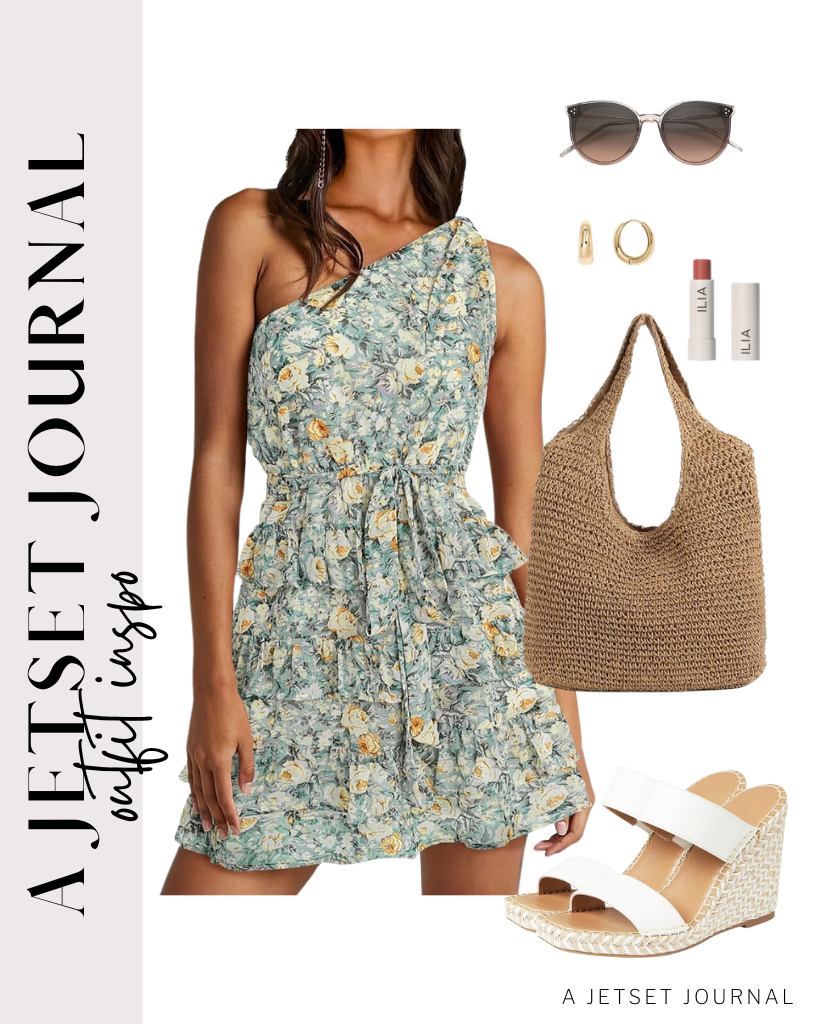 One Shoulder Floral Ruffled Mini Dress / Hand-woven Soft Large Straw Shoulder Bag / Espadrille Wedge Sandals / ILIA – Balmy Tint Hydrating Lip Balm / SOJOS Classic Round Sunglasses / PAVOI 14K Gold Plated Sterling Silver Post Small Chunky Hoops Earrings