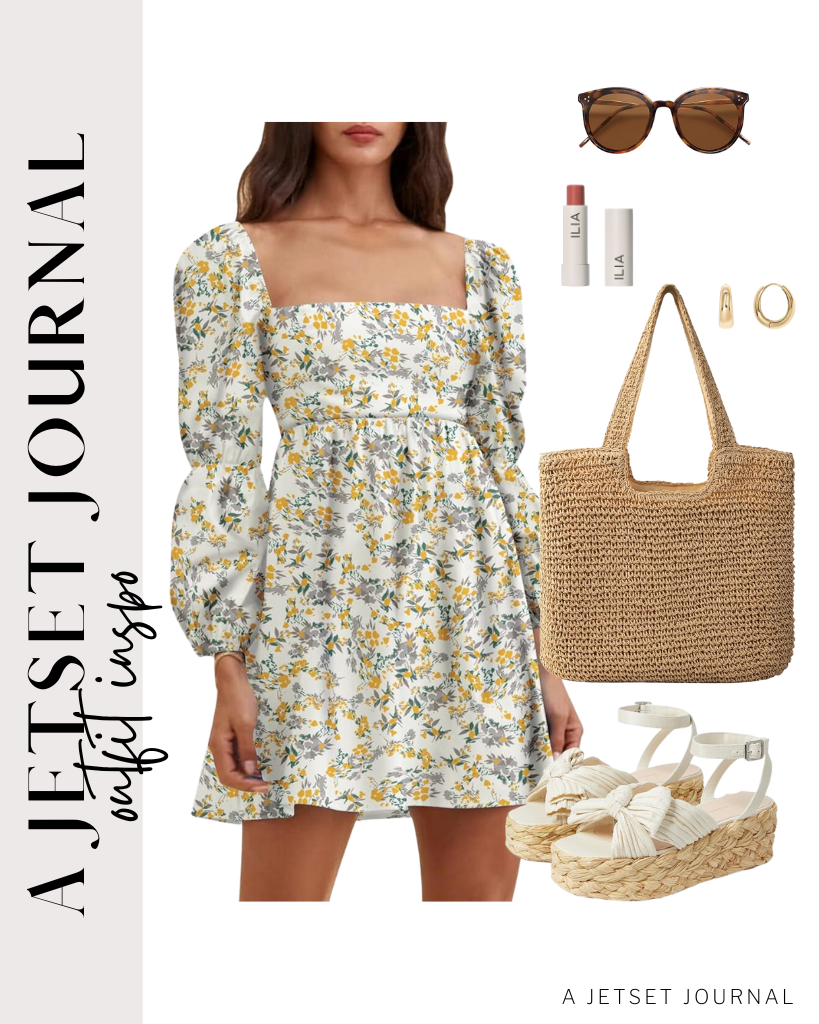 Outfit 2: A long sleeve floral mini dress with a fun square neckline. This dress is paired with platform espadrille sandals with a fun bow knot detail and ankle strap, and a woven straw tote bag in a neutral color.