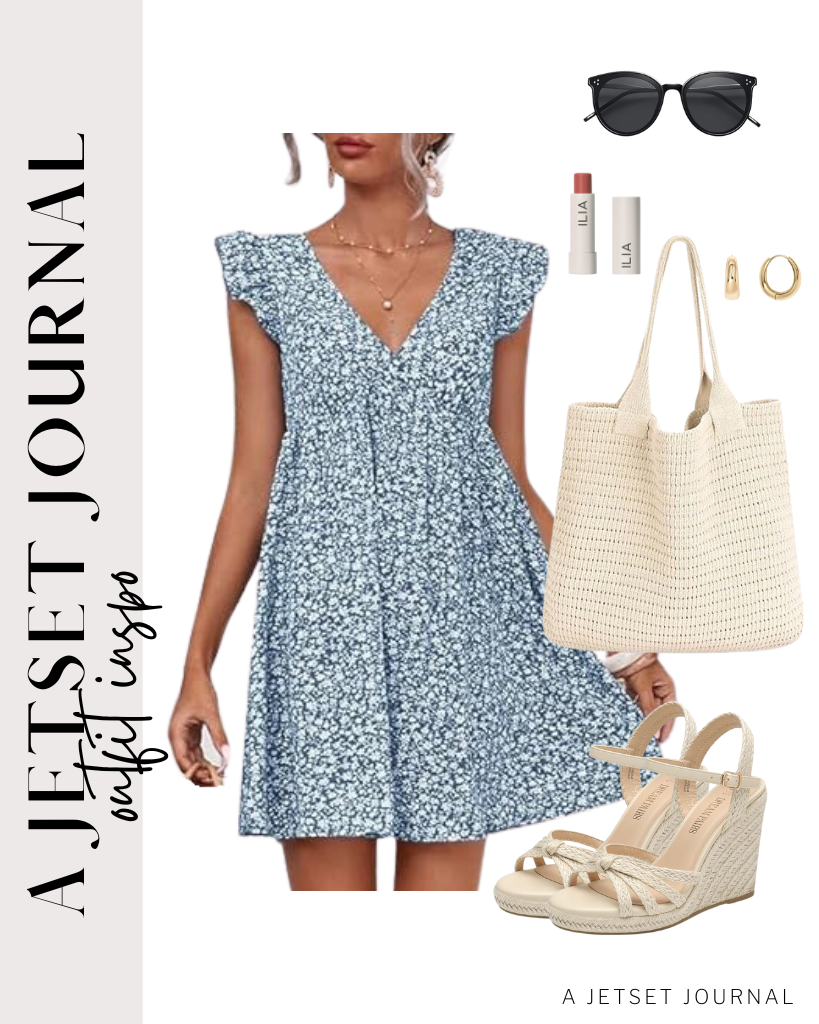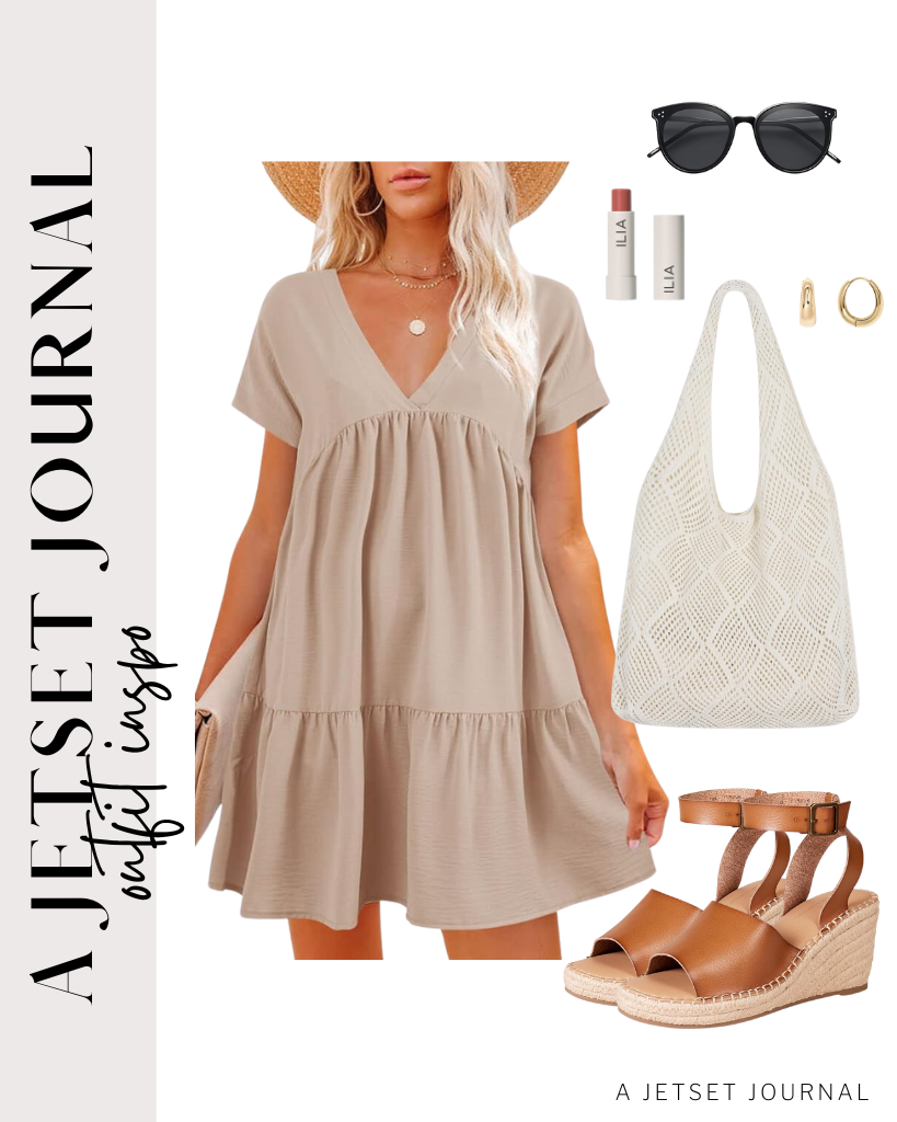 Flowy V-Neck Babydoll Mini Dress / Crochet Tote Bag / Amazon Essentials Wedge Espadrille Sandal / ILIA – Balmy Tint Hydrating Lip Balm / SOJOS Classic Round Sunglasses / PAVOI 14K Gold Plated Sterling Silver Post Small Chunky Hoops Earrings
