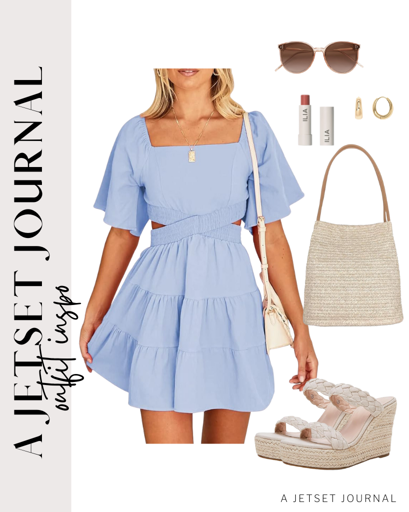 Outfit 5: A short-sleeve light blue mini dress that has a square neckline and criss cross waist detail. This beautiful dress is paired with closed toe espadrille platform shoes with a criss cross strap, and a neutral straw bucket bag.