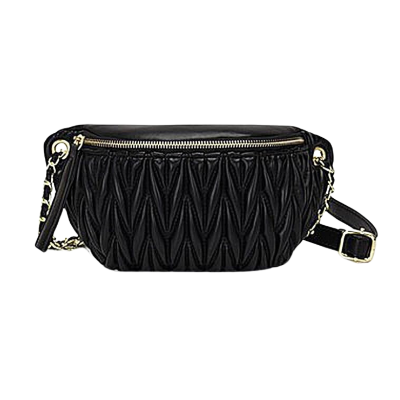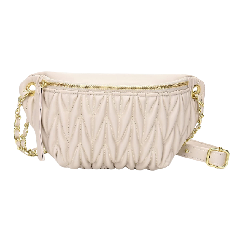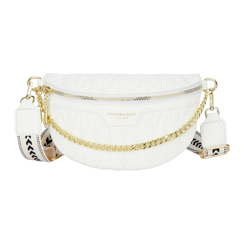 Another favorite of mine is the white textured belt bag with a gold chain design hanging in front. I love the contrast of the gold chain and it will totally match with all of your gold jewelry you can wear to style it!