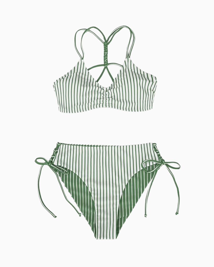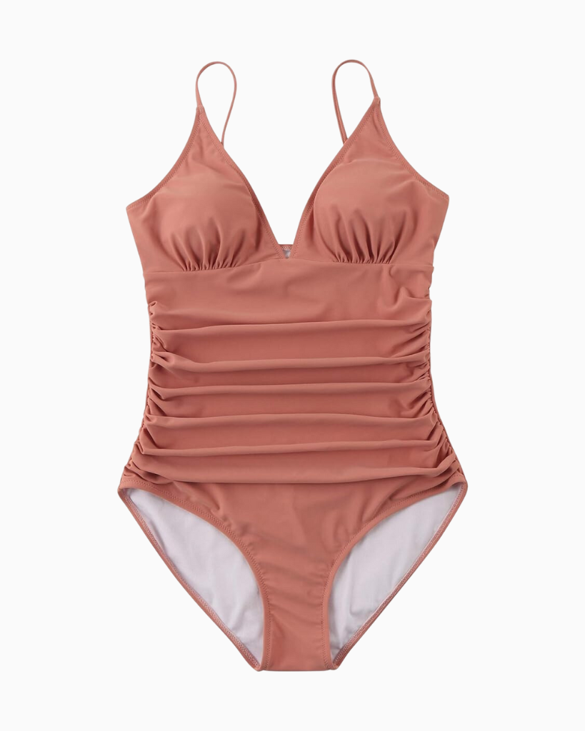 Another super flattering one piece is the classic triangle top with thin straps and ruching all along the body of the suit. It’s my go to style for standard pool days.