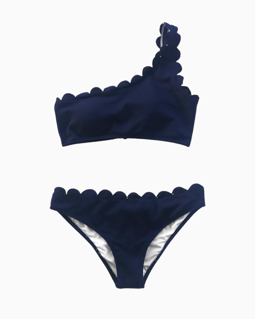 For a super fun bikini, you’ll love this one strap two piece with scalloped detailing! The scallops along the hemline of both the top and bottom make this so unique and super cute. It’d be great for a beach day and you can take the cutest photos in it!