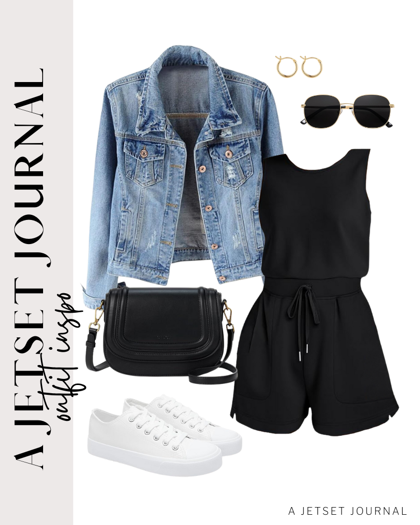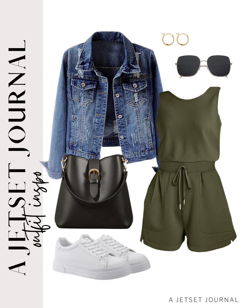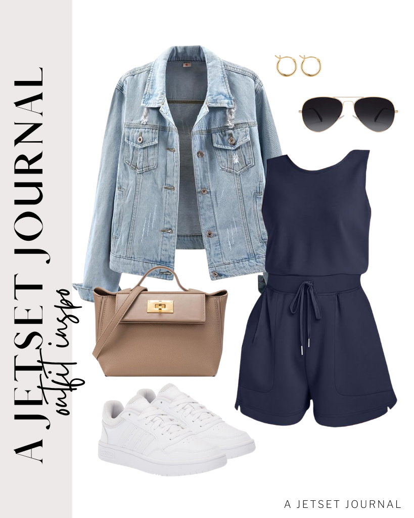 Outfit 4: I love a good navy and white color combo! This navy sleeveless romper looks so cute with a white denim jacket over top. Add a pair of white sneakers and a light neutral shoulder bag to accessorize. Finish off with a pair of aviator style sunglasses from SOJOS on Amazon.