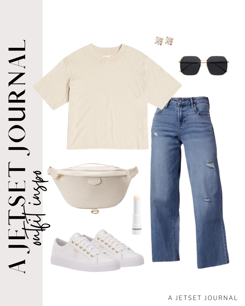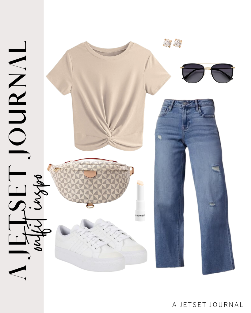 Outfit 4: I love the twist front detail on this short sleeve top for an added touch. You can’t go wrong with a pair of platform white sneakers and they look especially good with these baggy leg style jeans. Then, I added a belt bag with a bit of pattern to it to spice up the outfit, and these round vintage style shades complete the vibe.