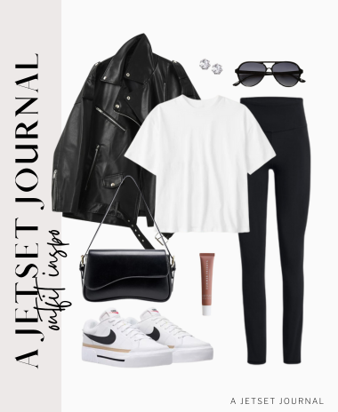Outfit 5: Dress it up and go for a darker outfit vibe! Grab the lightweight cardigan jacket in black and wear with a white bodysuit underneath for some contrast. Add these bestselling Levi’s and these gorgeous studded Mary Jane flats from Steve Madden. Accessorize with oversized black sunnies and a cute quilted bag to match.