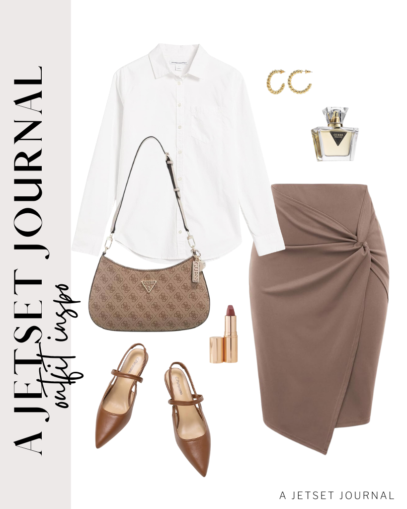 Outfit 4: Grab a basic white button down shirt and add a fun wrapped pencil skirt to elevate the look even more! Add these brown pointed toe kitten heel and an ADORABLE brown patterned bag from Guess to match.