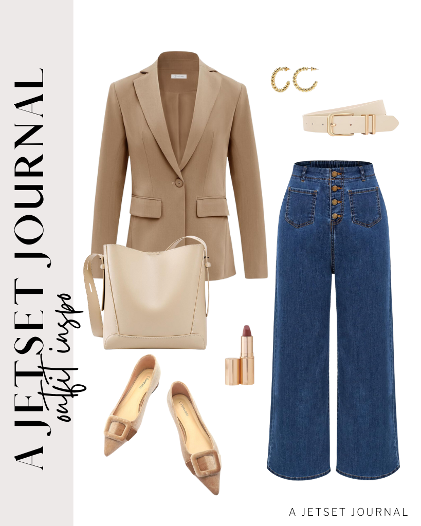 Outfit 5: A blazer and jeans is the perfect mix between elevated and casual. Put on a pair of pointed toe flats and a light neutral bag to match the vibe.