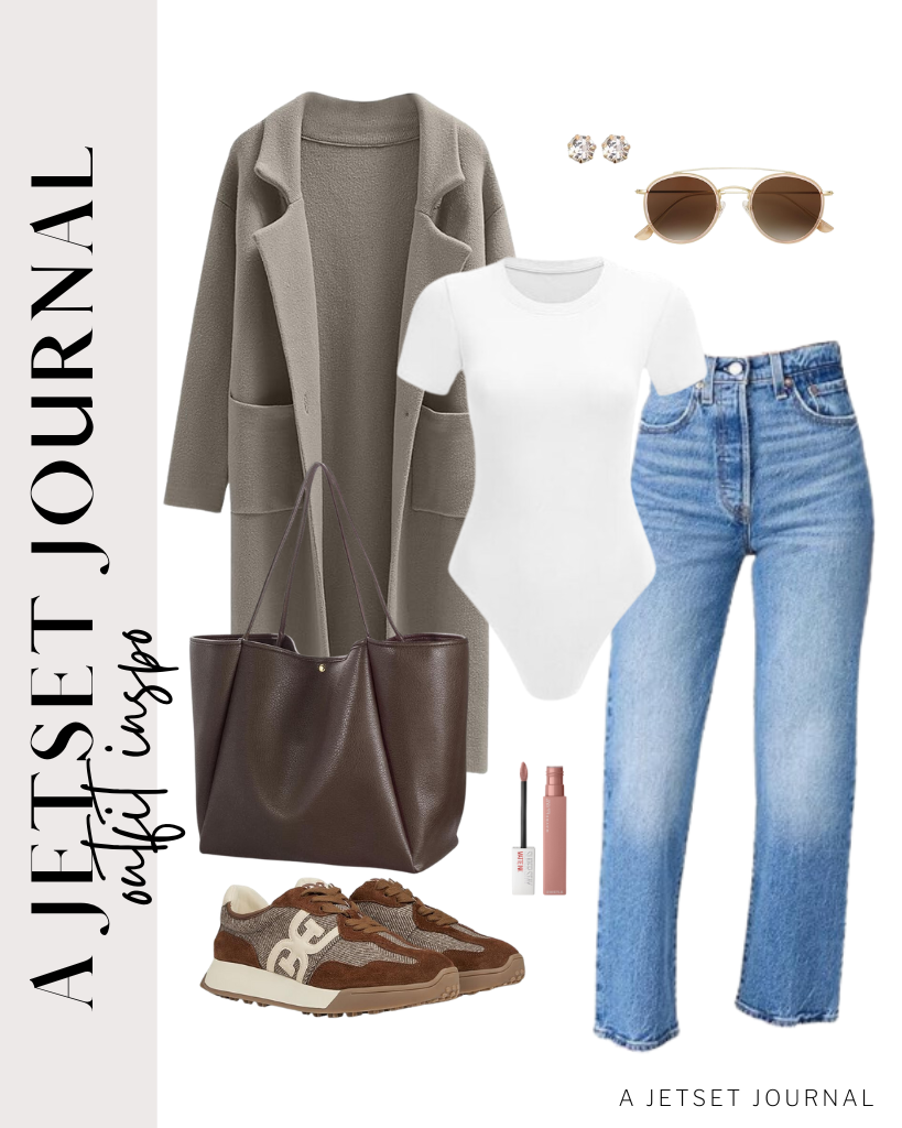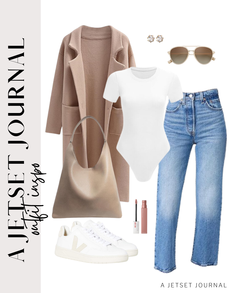Outfit 1: A light beige cardigan coat with a simple white bodysuit and light wash denim. Pair with some white Veja sneakers for a comfortable look. Add a brown tote bag for your essentials and finish off with oversized square sunnies.