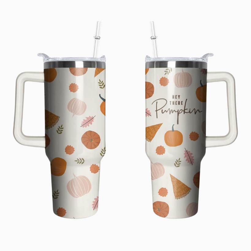This Swig thermos with pumpkins and trucks all over it is SO adorable! It’s an insulated tumbler with a lid so it will keep your drink hot or cold for a long time. This would be perfect for walking around a pumpkin patch with the fam! Another adorable insulated option is this “Hey There Pumpkin” 40oz tumbler with a handle and a straw. This is my favorite kind of cup to fill with water and drink throughout the day!