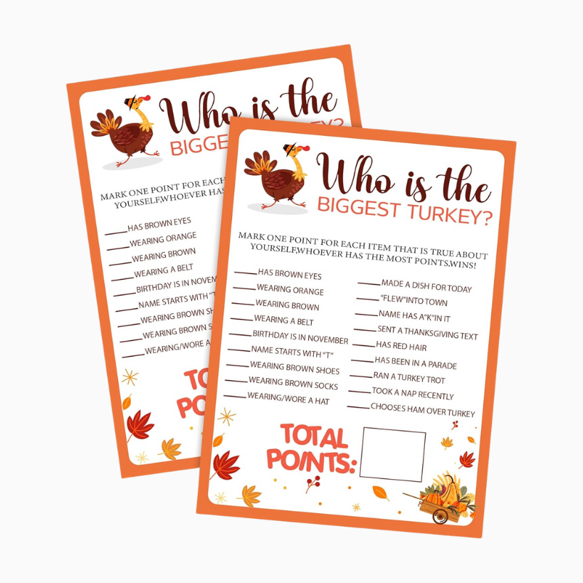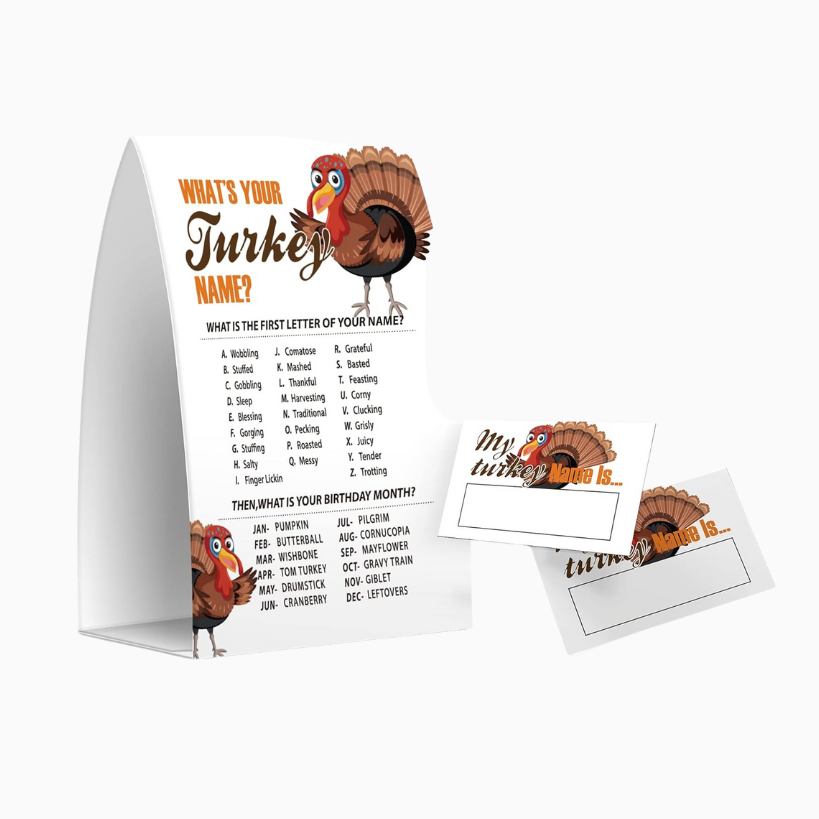 Games are always a fun addition to add to a Friendsgiving celebration! There’s a really cute “What’s Your Turkey Name” or “Who is the Biggest Turkey” themed games you can play with your friends that evening! I also added these adorable paper glasses that would be super cute for a photo op.