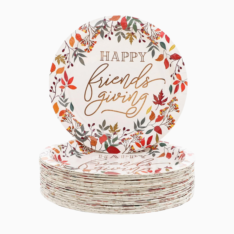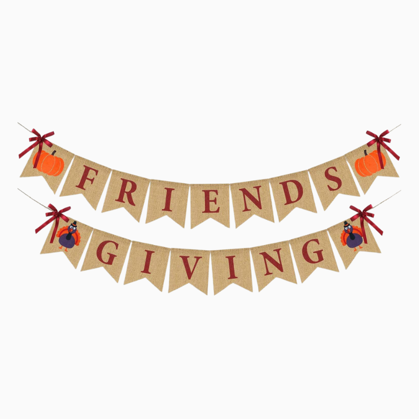 I love the Friendsgiving themed stuff like having disposable cups, plates, and napkins on theme. Also you can decorate your dinging space with this Friendsgiving banner or some other cute fall stuff like hanging lanterns in cute fall colors or a table scape with gourds pumpkins and leaves.
