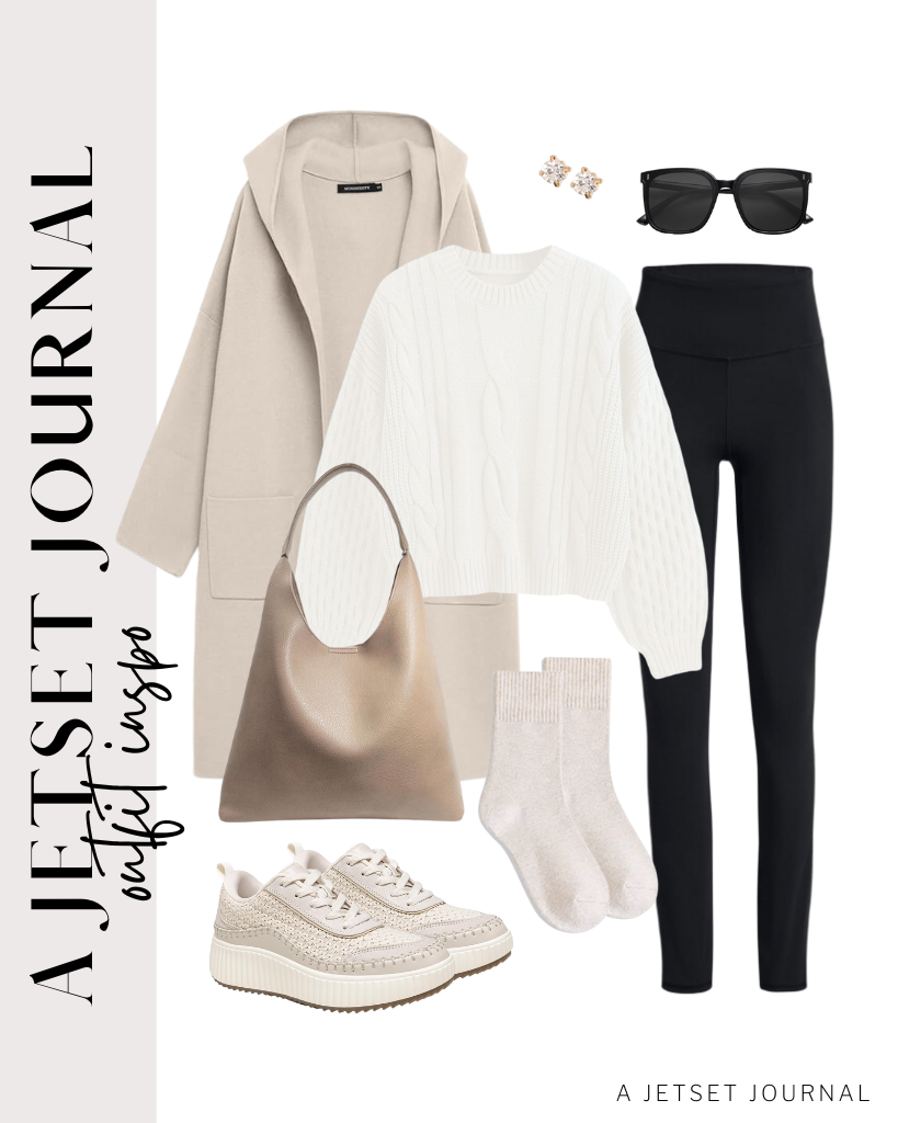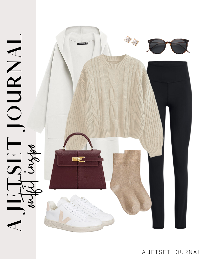 Outfit 2: A white long cardigan coat over a neutral cable knit sweater and leggings look so good with a quilted carryall bag and white Veja sneakers. Add some round sunnies to complete the look.