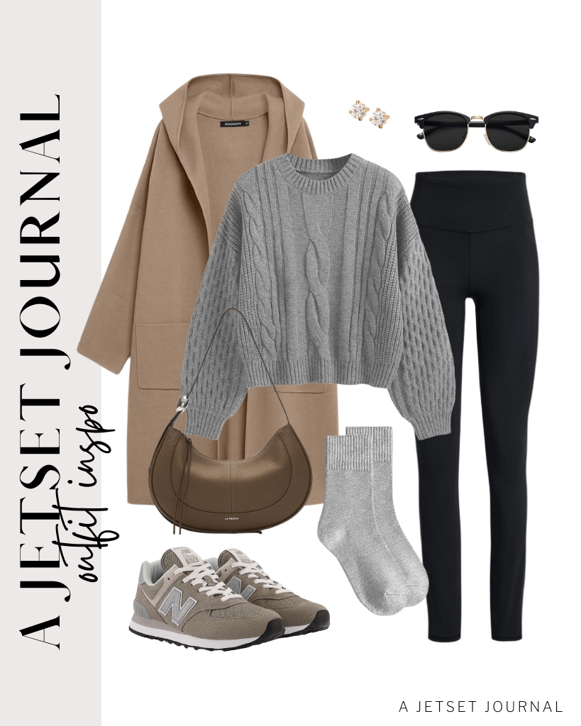 Outfit 3: This khaki brown and gray color combo is so chic! I love the look of this gray knit sweater and black leggings with a khaki brown layer over top. These New Balance sneakers are the perfect color combo to match and a crescent bag in a brown gray color. Complete with semi-rimless sunglasses.