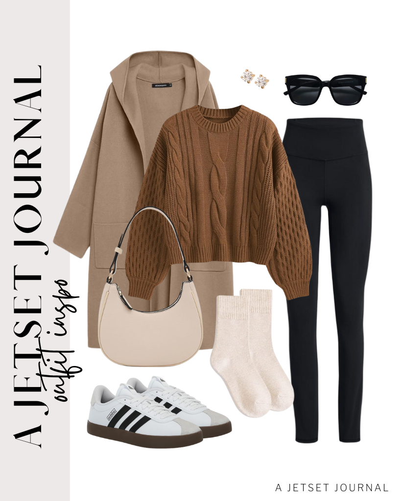 Outfit 4: Another super chic color combination is this black and chocolate brown! The chocolate brown sweater is a cute piece in between the black leggings and the black long cardigan jacket. I love how it looks with these adidas sneakers and a chocolate brown tote bag. Finish with square polarized sunglasses.