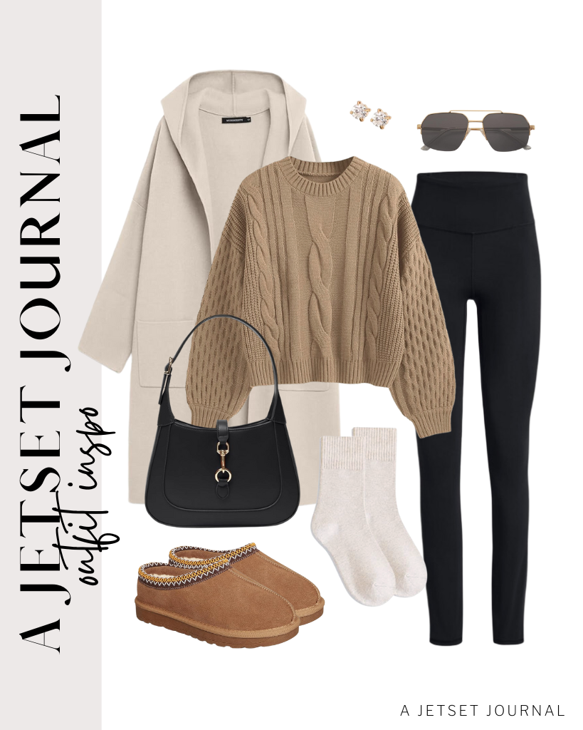 MEROKEETY Long Hooded Open Front Coatigan / ZAFUL Women’s Solid Knit Cable Sweater / Small Shoulder Bag / Fleece Lined Mules / SOJOS Trendy Aviator Sunglasses / High Waisted Leggings / Mini Bamboo Crew Socks / Studded Earrings Set