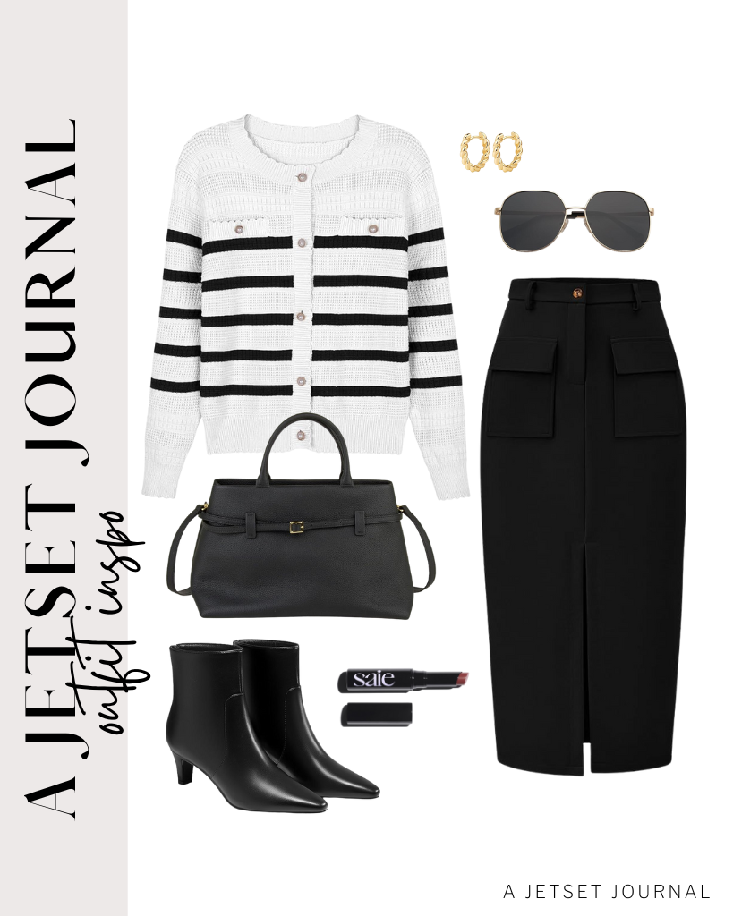Outfit 1: A white and black striped button down cardigan with black midi skirt. Style with black pointed toe ankle boots, a top handle satchel bag, and oversized sunnies.