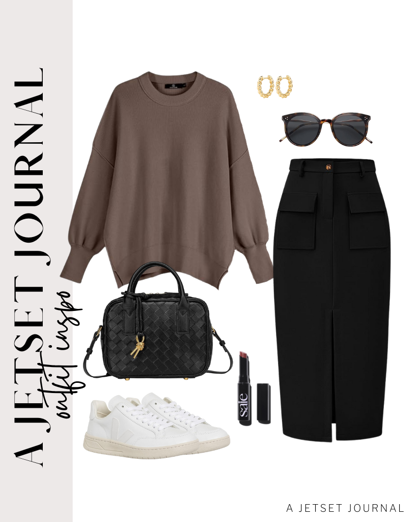 Outfit 2: Try this oversized batwing sleeve pullover in a rich brown with your cargo skirt. Accessorize with some simple white sneakers, a woven top handle bag, and some round sunglasses.
