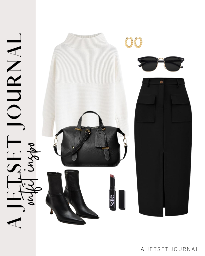 Outfit 3: A white turtleneck pullover gives a great contrast to this black midi skirt. Add some heeled pointed toe ankle boots, a black satchel purse, and some black semi-rimless sunnies to match.