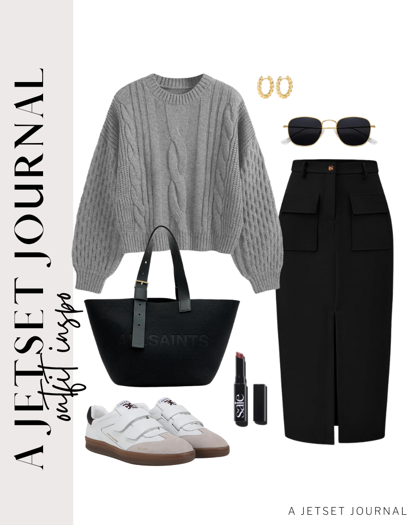 Outfit 4: This chunky gray sweater is so cozy and looks great paired with the black cargo skirt. Style with Sam Edelman sneakers, a tote bag, and some polarized sunnies.