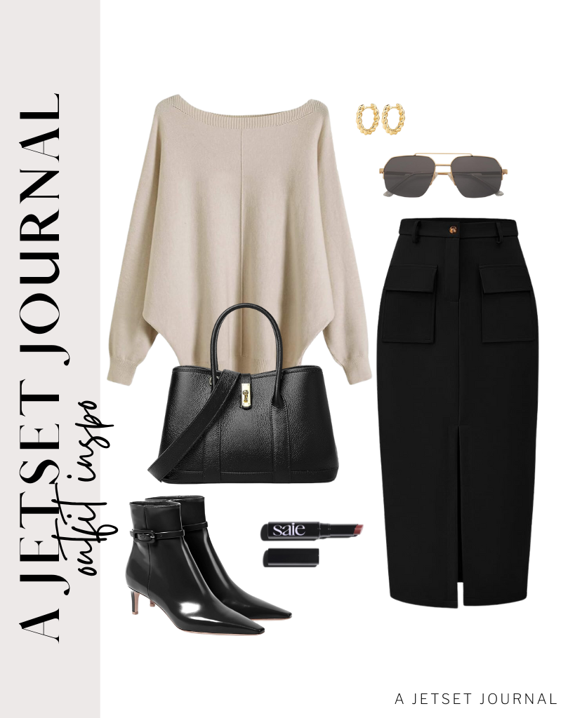 Outfit 5: This beige boat neck sweater is so sleek and looks perfect with a high waisted skirt. Add some kitten heel booties, a chic leather bag, and some SOJOS sunglasses.