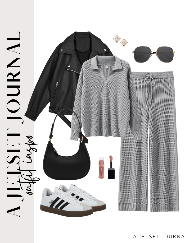 Outfit 1: A light gray lounge set with a black faux leather jacket over top. Style with gray and black adidas sneakers, a simple black shoulder bag, and some oversized sunglasses.