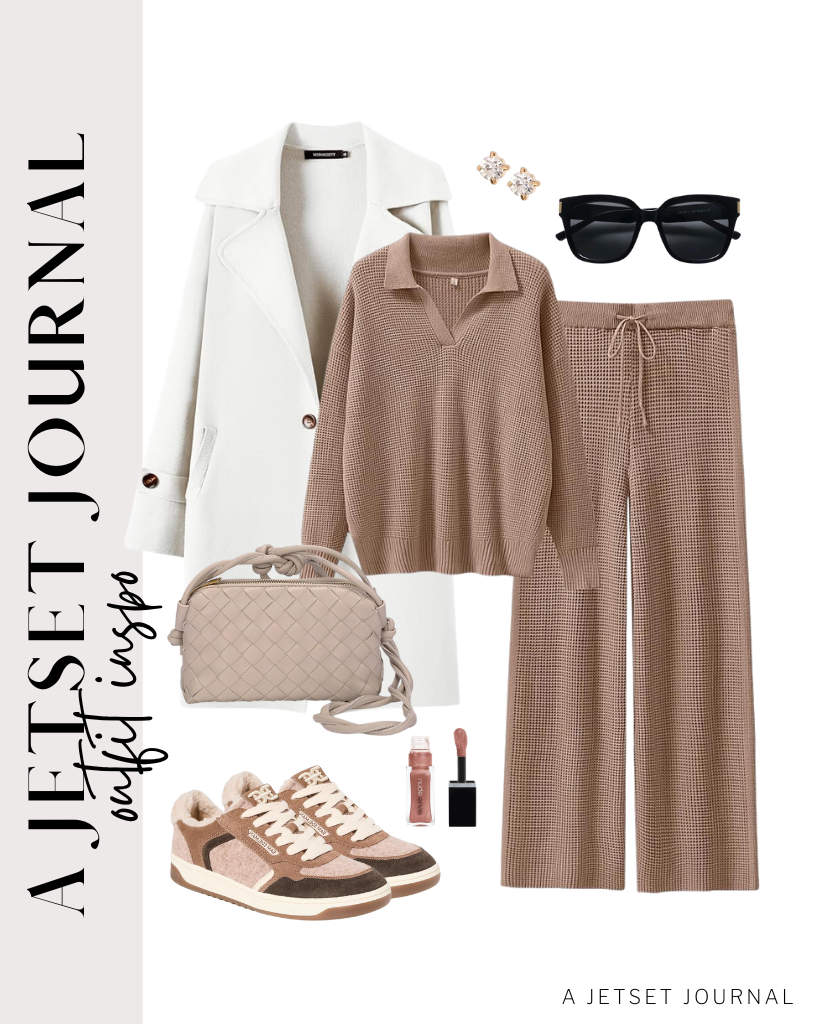 Outfit 2: This khaki color waffle knit set looks adorable with a chic white cardigan coat over it. These Sam Edelman sneakers match perfectly! Add a neutral crossbody back and some sunnies.