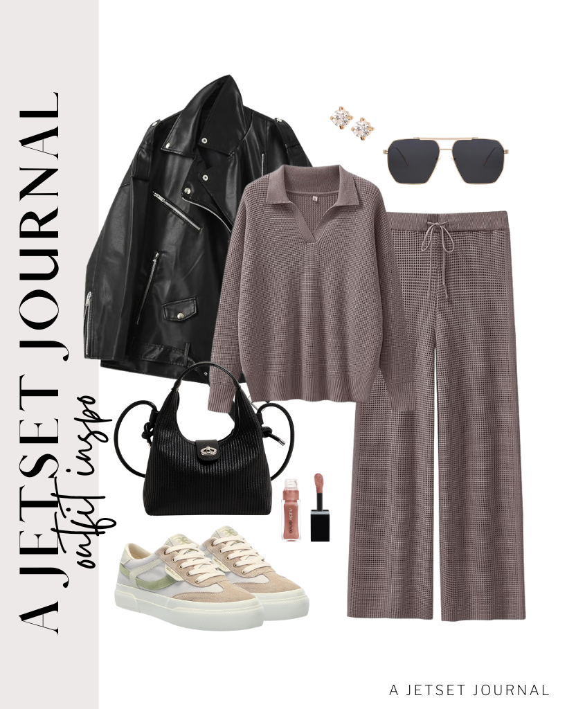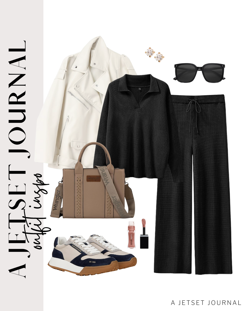ANRABESS Two Piece Waffle Knit Set / LY VAREY LIN Faux Leather Jacket / SOJOS Oversized Sunglasses / Wrangler Medium Tote Bag / Sam Edelman Women’s Layla Sneaker / Studded Earrings Set / Envie Lip Gloss