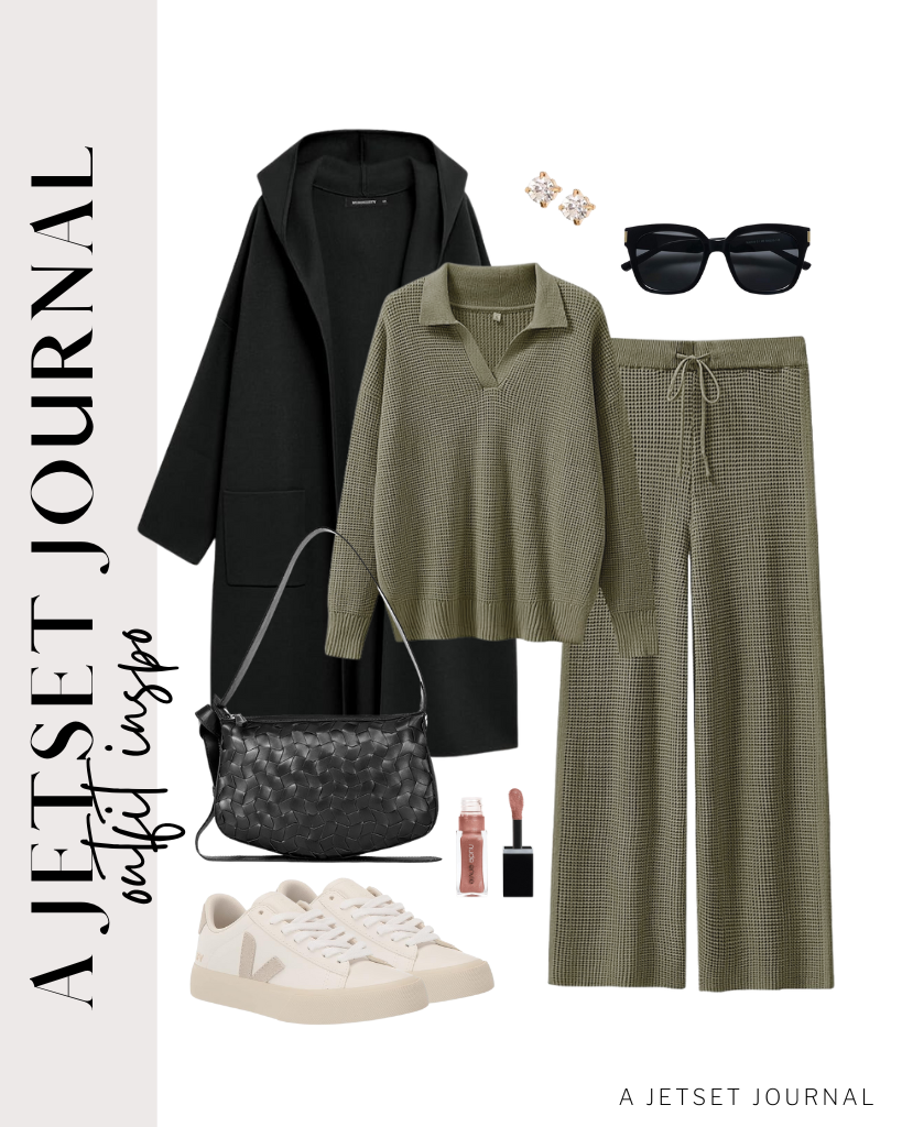 Outfit 4: Army green and black is such a good color combo. Add a long black cardigan coat over an army green lounge set. Style with neutral sneakers from Vejas and then add a black bag and black sunglasses.
