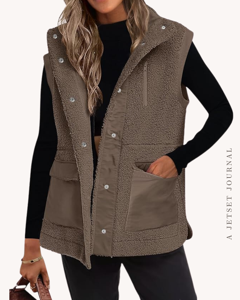 I’m obsessed with this oversized faux leather jacket with pockets. It looks cute with casual or dressy outfits, whatever fits your personal style. Another really fun layer is this long sherpa style vest with pockets. Wear over any of your favorite long sleeve tees or sweaters this season.