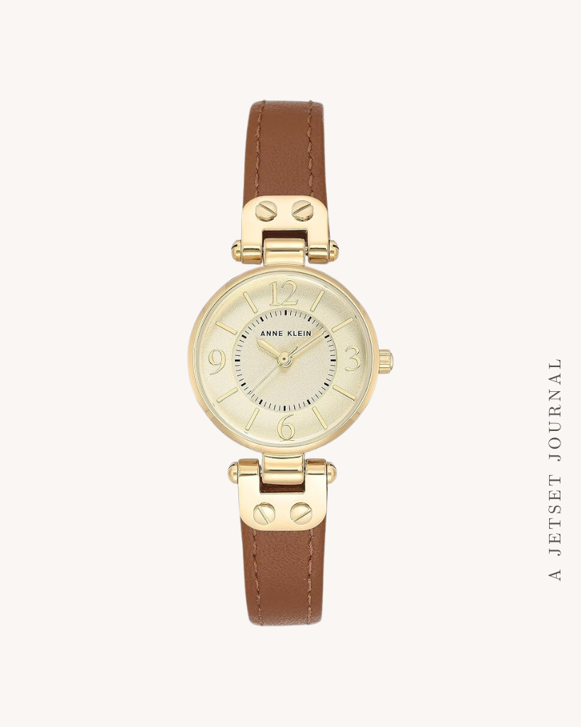 For other timeless accessories, check out this simple black shoulder bag for an affordable price. I also found this gorgeous Anne Klein wrist watch with a brown leather band and gold detailing.