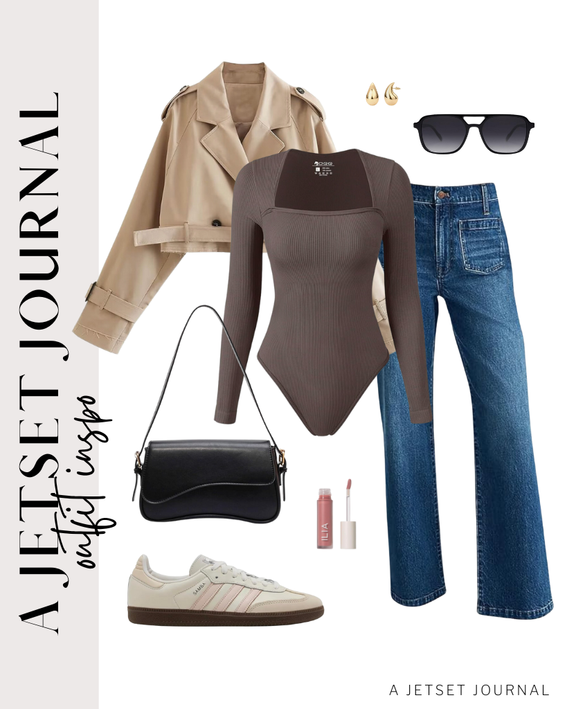 Outfit 1: First up is for the neutral girlies. Style this brown long-sleeve bodysuit with high-rise wide-leg denim jeans layered with a chic cropped trench coat. Add a black clutch saddle bag, and the Adidas Samba OG in the cloud white light pink colorway. Finish off everything with some gradient aviator sunglasses.
