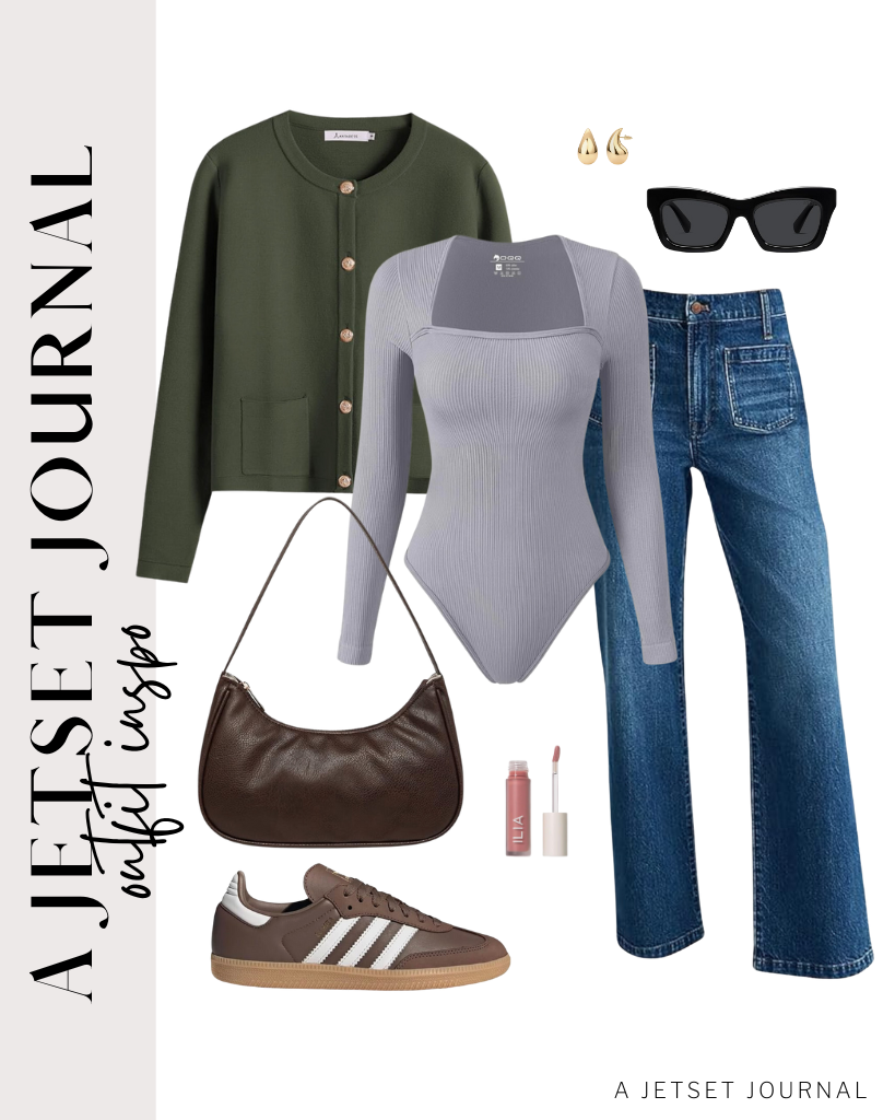 Outfit 2: To add some jewel tones to the look, you can opt to wear this gray long-sleeve bodysuit with an olive green wool coat and the same wide-leg jeans. Pair it with the Adidas Samba OG in earth strata gum and a brown leather retro clutch to complete the look.