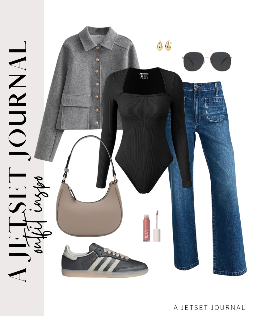 Outfit 3: You can also level up a classic black look by styling this ribbed black bodysuit with a gray wool coat. Still wearing the same medium wash jeans, I added a neutral beige crescent shoulder bag, and the black beige pink combo of the Adidas Samba.