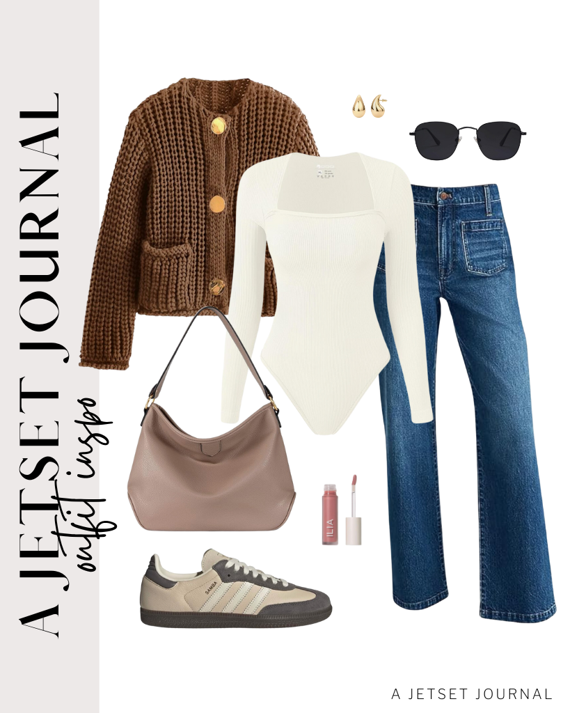 Outfit 4: Another option is to try out this white long-sleeve bodysuit, a brown chunky knit cardigan, styled with the same jeans, and a cream-white sand charcoal Adidas Samba. Love this if you’re in the mood to just chill and romanticize your life in a coffee shop.