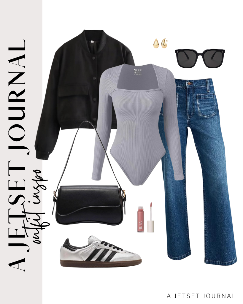 Square Neck Bodysuit / Cropped Bomber Jacket / adidas Samba / Shoulder Bag / SOJOS Trendy Oversized Sunglasses / Cicy Bell Women’s High Waisted Baggy Jeans / Tinted Lip Oil / Teardrop Chunky Hoop Earrings