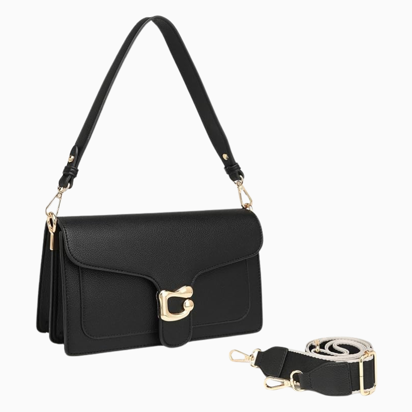 For bags, I like having a light and a dark bag so that they can match my looks. This black shoulder bag with a fun buckle detail is adorable to wear out at night. This asymmetrical cream shoulder bag is such a fun option, too!